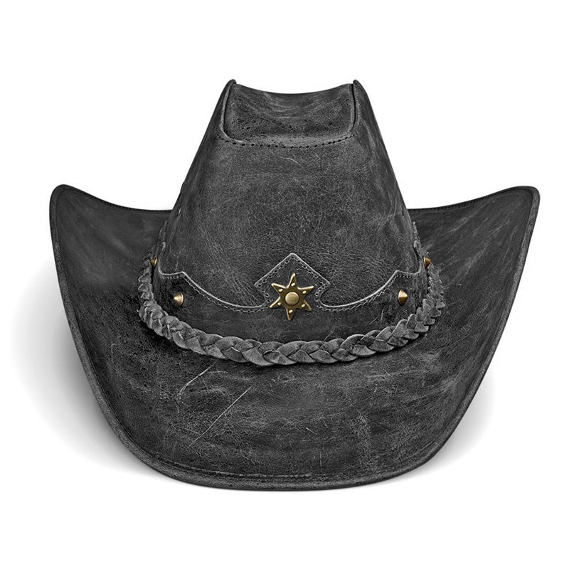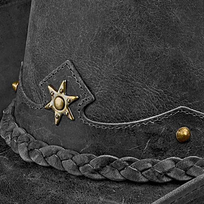 Chapéu Country Americano Couro Preto Rústico Star, um ícone de sofisticação e estilo autêntico. Cada chapéu é meticulosamente confeccionado em couro legítimo heritage, oferecendo não apenas uma estética visualmente impactante, mas uma durabilidade que resiste ao teste do tempo.